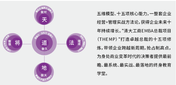 項目創(chuàng)立至今已有十五載,三次升級三次迭代,歷經(jīng)清大工商EMBA1.0-6.0,陪伴和成就10000+企業(yè)家、高級管理者的成長、成熟與成功。15年的成功辦學(xué)經(jīng)驗以及對中國企業(yè)家群體不斷升級的學(xué)習(xí)需求的深度調(diào)研、深刻理解,全新定義總裁EMBA終身學(xué)習(xí):獨家研創(chuàng) “道、天、地、將、法” 全新清大工商EMBA7.0課程體系。“道”模塊解決做久之道,“天”模塊解決做對之道,“地”模塊解決做大之道,“將”模塊解決做強之道,“法”模塊解決做成之道。